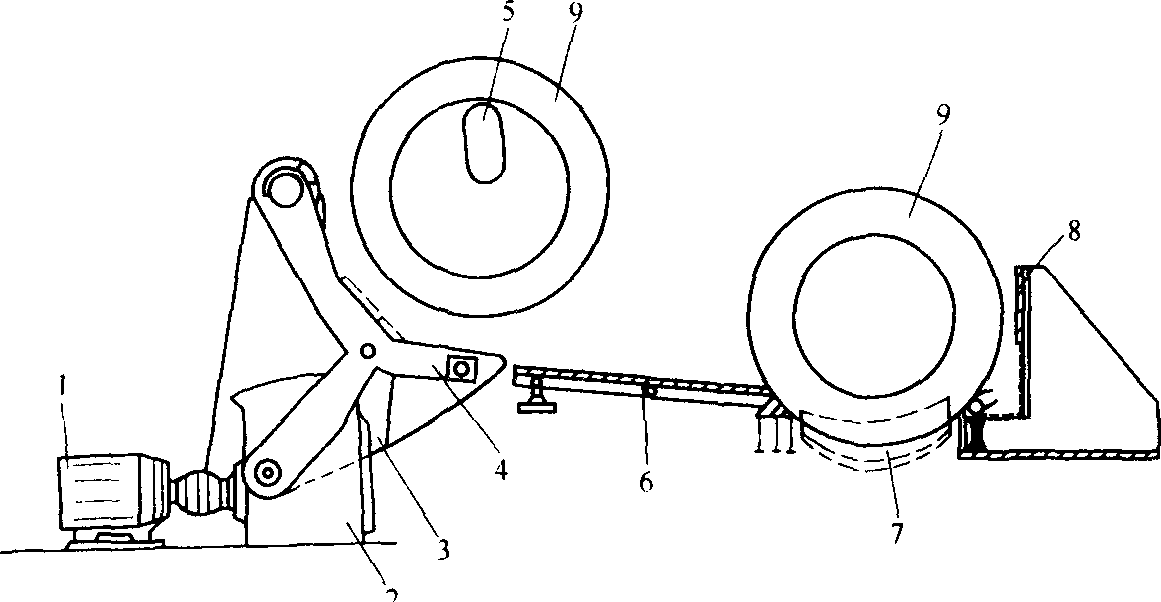 圖1-3用C型鉤卸盤卷的卸卷裝置示意圖 1,電機 2,渦輪減速機 3,曲柄機構 4,托卷板 5,形鉤 6,銜接鋼板 7,步進梁 8,固定擋板 9,盤卷