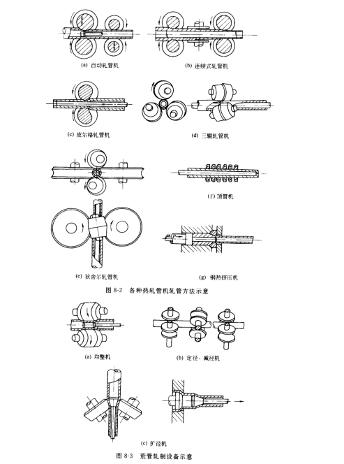 軋,管是將空心毛管軋成接近成品尺寸的荒管。常見的軋管方法有自動軋管機(jī)、連續(xù)式軋管機(jī)(全浮動式 MM、限動心棒 MPM)、皮爾格軋管機(jī)(周期式軋管機(jī))、三輾軋管機(jī)、狄舍爾軋管機(jī)、頂管機(jī)和鋼熱擠壓機(jī),如圖 8-2所示。