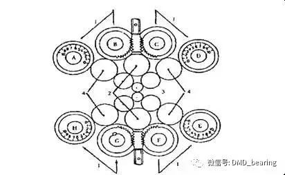 (1)支承輥(2)一中間輥、二中間從動(dòng)輥(3)工作輥(4)二中間傳動(dòng)輥