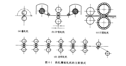 熱軋薄板有單張生產(chǎn)和成卷生產(chǎn)兩種生產(chǎn)方式,圖6-1所示為熱軋薄板軋機的主要型式。單張熱軋薄板主要是在單輥驅(qū)動的二輾不可逆式軋機上用疊軋的方法進行生產(chǎn),國內(nèi)1200疊軋薄板機屬于這一類,其成品厚度為0.2~3.7mm。這類軋機工藝簡單,設(shè)備少,故投資少,建廠快。但其勞動強度大,生產(chǎn)率低,金屬消耗大,板材表面質(zhì)量不高,目前處于淘汰地位。