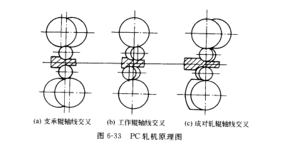 PC軋機基本上是一種四輥軋機,與一般四輥軋機主要不同之處是將平行布置的軋輥改變交叉布置。在軋制過程中,當離開中心的距離增大時,gun風也增大,一次來控制凸度,這與使工作輥凸度變化等效。就是說,PC軋機是利用調節(jié)軋輥軸線的交叉角度來控制凸度,是輥縫可調,而工作輥又不至于產生撓度。因此,凸度控制不會永祥工作輥的強度和剛度。軋輥軸線交叉布置可以有三種形式(見圖6-33):支撐輥軸線交叉布置:工作輥軸線交叉布置和承兌軋輥軸線交叉布置等。只要改變交叉角,就能改變軋輥凸度。工作輥軸線交叉布置時,軋輥凸度變化范圍較大,但是這種布置形式的軋機未能的到實際應用。因為這種形式布置的軋機,在公祖哦gun和支撐輥之間產生較大的相對滑動,使軋輥磨損和能量消耗大為增加。當支撐輥軸線交叉布置時,其效果同工作輥軸線交叉布置時一樣,在工作輥和支撐輥之間同樣產生相對滑動,使軋輥磨損和能量消耗大為增加。當軋輥軸線承兌交叉布置時,工作輥和支撐輥之間就不會產生相對滑動,這就消除了上述弊端,因此得到實際應用的PC軋機即時采用“承兌交叉”布置的軋機。